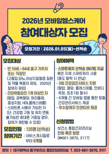 [무한뉴스=최진수 기자] 대구 중구는 스마트폰과 활동량계를 활용해 개인 맞춤형 건강관리를 지원하는 ‘2026년 모바일 헬스케어 사업’ 참여자 125명을 선착순으로 모집한다.