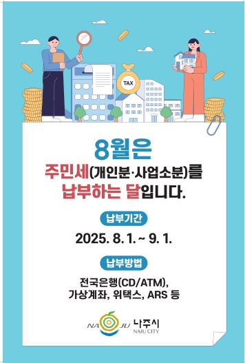 8월 주민세(개인분)는 7월 1일 기준 나주시에 주소를 둔 세대주에게 1만 1천 원(교육세 포함)이 부과되며 오는 8월 16일부터 9월 1일까지 납부하면 된다.