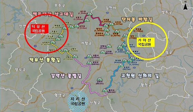 테마는 △단지봉 바람길(수행과 명상) △고천원 신화의 길(고천원 신화와 온천힐링) △감악산 꽃별길(합천호 전망과 별빛 트레킹) △덕유산 봉황길(1,500m급 고봉 도전) △백두대간 상고대길(상고대와 약초체험) 등으로 구성된다.