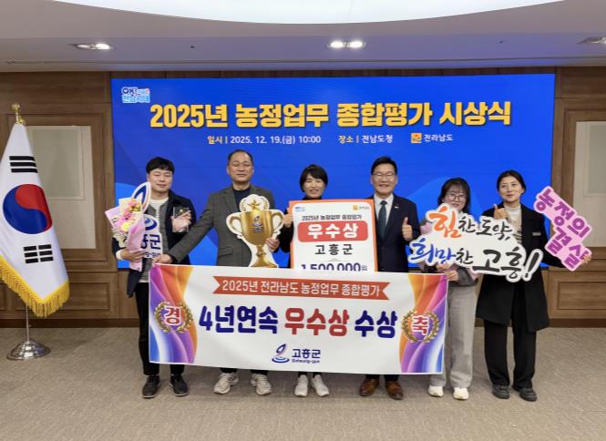 [무한뉴스=정민정 기자] 고흥군이 전라남도가 주관한 ‘2025년 농정업무 종합평가’에서 4년 연속 ‘우수상’을 수상하며, 농업 강군(强郡)으로서의 위상을 다시 한번 입증했다.