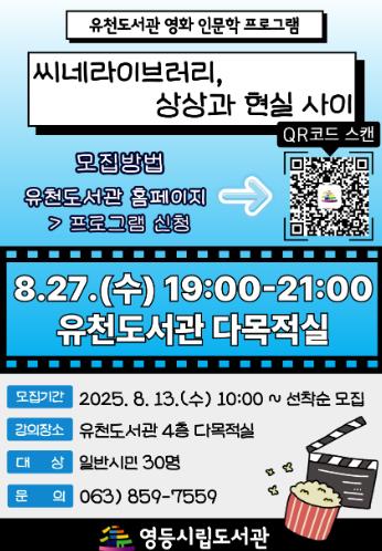 유천도서관 관계자는 "이번 강연은 영화 감상의 즐거움을 넘어 인문학적 통찰을 함께 나누는 시간이 될 것"이라며 "앞으로도 시민의 문화생활을 풍요롭게 할 다양한 프로그램을 지속적으로 마련하겠다"고 전했다.