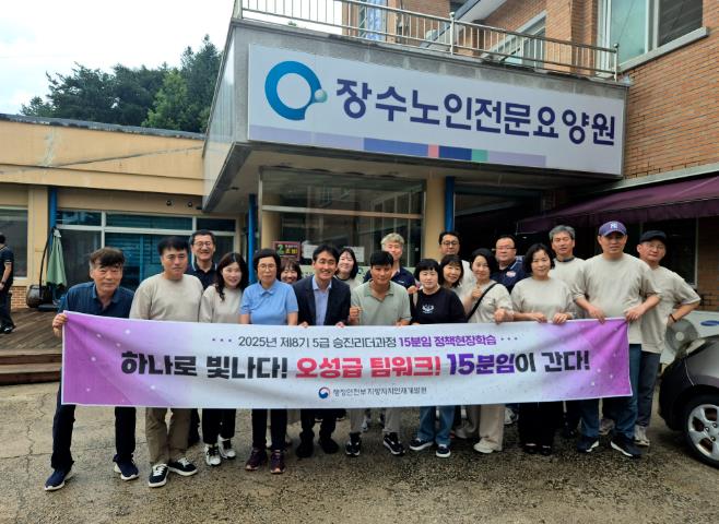 [무한뉴스=정민정 기자] 장수군은 지방자치인재개발원에서 연수 중인 제8기 5급승진리더과정 15분임 교육생들이 천천면에 위치한 장수노인전문요양원을 찾아 봉사활동과 정책연구 과제에 대한 현장학습을 펼쳤다고 8일 밝혔다.