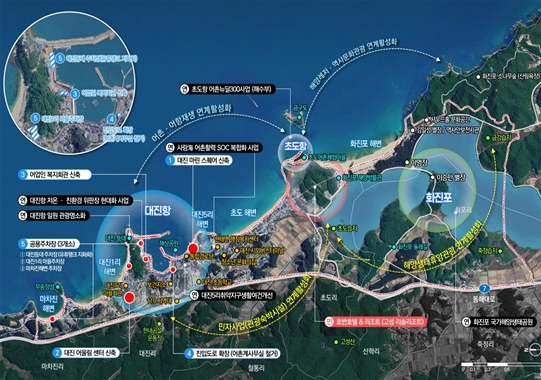고성 대진항은 ‘경제도약형(1유형)’ 사업으로, 인근 화진포 리조트 개발과 연계해 수산물 가공·유통시설 및 관광 인프라를 구축하고, 민자사업과 어촌이 상생하는 강원 북부권 해양산업·관광 복합경제 거점으로 육성할 예정이다.