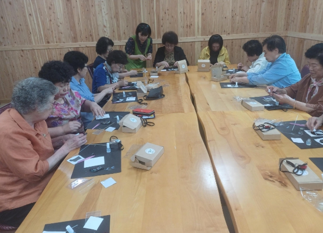 | ▲ 여수 미평주공아파트 입주민들이 우리노리협동조합에서 제공한 ‘자개 공예 만들기’ 체험을 하고 있다 |