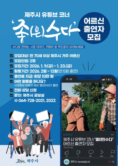 1월 9일부터 23일까지 제주시 누리집을 통해 모집하며, 선발된 어르신들은 제주시 공식 유튜브 채널에서 1년간 활동하게 된다.