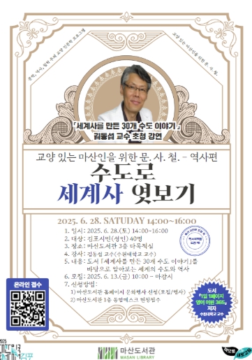 [무한뉴스=정승훈 기자] 김포시 마산도서관의 기획 인문학프로그램 '교양 있는 마산인을 위한 문.사.철.'의 6월 역사편 '수도로 세계사 엿보기'가 6월 28일 14시부터 16시까지 진행된다.