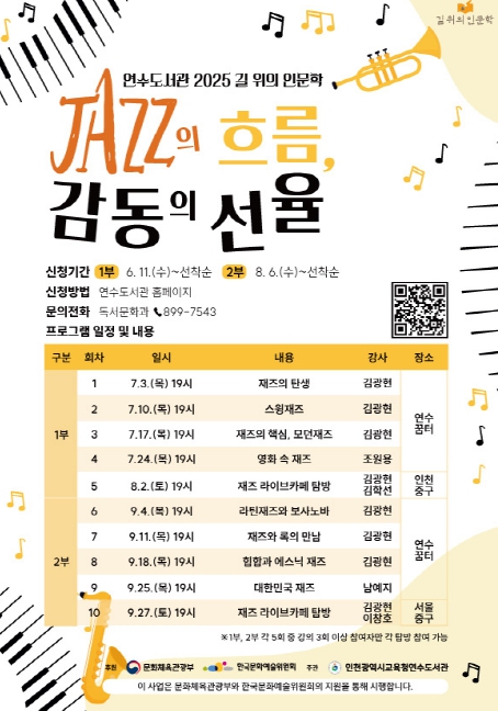 [무한뉴스=정승훈 기자] 인천광역시교육청연수도서관은 문화체육관광부 주최, 한국문화예술위원회 주관의 2025년 ‘길 위의 인문학’ 공모사업에 선정돼 ‘재즈의 흐름, 감동의 선율’을 주제로 프로그램을 운영한다.