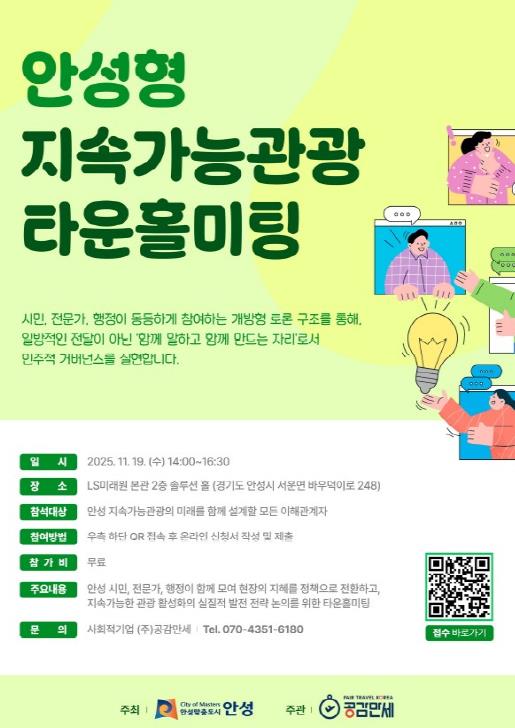 안성시 관계자는 “지속가능한 관광은 행정이 이끄는 정책이 아니라 시민의 참여와 공감으로 완성되는 과정”이라며 “이번 타운홀미팅이 시민의 목소리가 정책으로 이어지는 뜻깊은 계기가 되길 기대한다.”고 밝혔다.