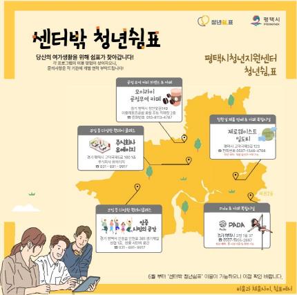 ‘센터밖 청년쉼표’는 현재 평택역 인근에 있는 청년 공간인 ‘청년쉼,표’ 외에 추가로 유휴공간을 확보해 청년들의 자유로운 공동체 활동에 대한 임차료와 프로그램 사업비를 지원하는 사업이다.