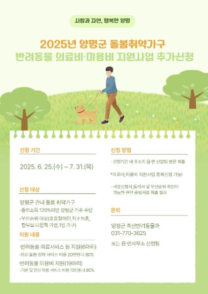 이번 지원 사업은 양평군에 주민등록을 두고 거주 중인 중위소득 120% 미만의 저소득층, 중증 장애인, 한 부모 가정, 다문화가정, 1인 가구 등 돌봄 취약가구를 대상으로 하며, 반려동물의 의료비, 돌봄 위탁비, 장례비는 최대 16만 원, 반려동물 미용비는 최대 8만 원까지 지원된다.
