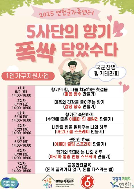 [무한뉴스=정승훈 기자] 정서적 어려움을 겪는 군 복무 청년 병사들을 위한 전문 치유 프로그램이 6월부터 본격적으로 운영된다. ‘1인 가구 지원사업 건강돌봄 프로그램’의 일환으로, 정서적 불안과 심리적 스트레스를 완화하고자 기획된 이번 프로그램은, 2025년 6월 한 달 동안 매주 월요일과 금요일, 총 6회에 걸쳐 ‘아로마테라피 심화 강의’를 운영할 예정이다.