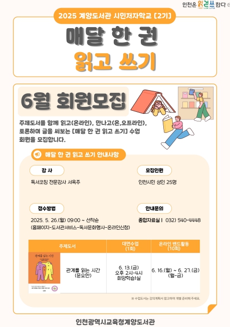 [무한뉴스=정승훈 기자] 인천광역시교육청계양도서관은 6월 13일부터 27일까지 인천 시민(성인)을 대상으로 시민저자학교 ‘매달 한 권 읽고 쓰기’ 6월 프로그램을 운영한다.