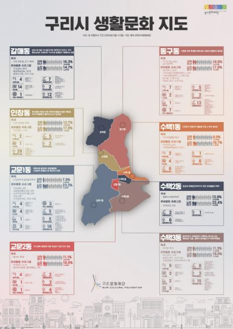 이번에 제작된 ‘구리시 생활 문화지도’는 구리시 동별 생활 문화 현안과 특성은 물론, 생활 문화 동아리·개인 활동가·단체·공간 등의 정보를 조사·연구해 시각화한 자료로, 포스터와 광고지 형태로 제작됐다. 이를 통해 지역 내 생활 문화 자원과 활동 주체를 한눈에 파악할 수 있도록 구성한 것이 특징이다.