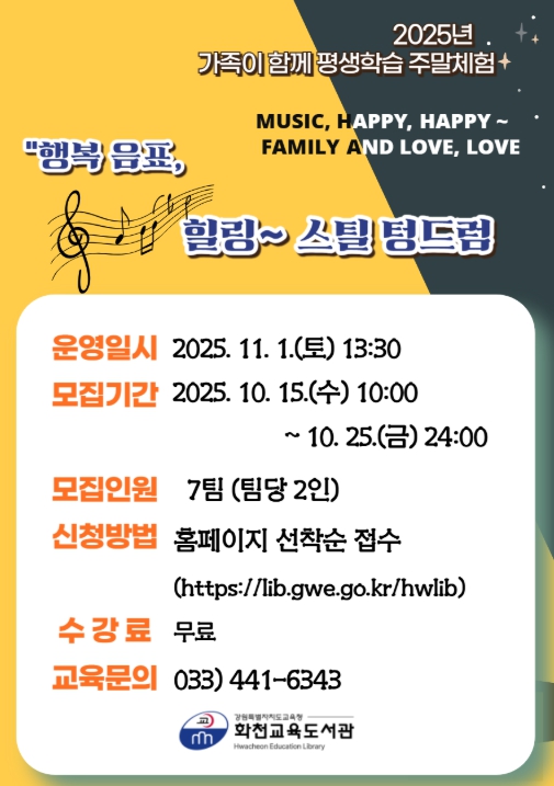 [무한뉴스=정승훈 기자] 강원도교육청 화천교육도서관은 군민을 대상으로 2025년 11월 평생학습 주말체험 ‘늦가을, 가족 음악 특강: 행복 음표, 힐링 스틸 텅드럼’을 운영한다.