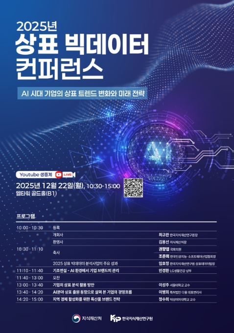 [무한뉴스=최진수 기자] 지식재산처가 주최하고 한국지식재산연구원이 주관하는 ‘2025년 상표 빅데이터 학술회의’가 12월 22일 10시 30분 엘타워 골드홀(서울 서초구)에서 개최된다.