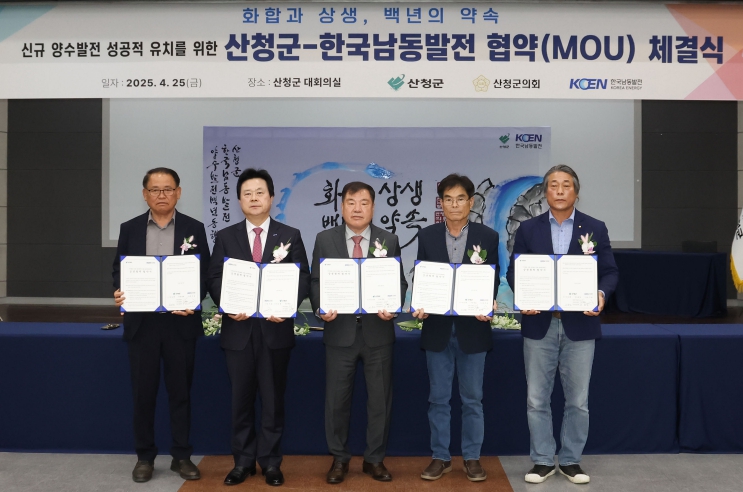 25일 산청군은 군청 대회의실에서 한국남동발전㈜과 ‘신규 양수발전사업 유치를 위한 업무협약(MOU)’을 체결했다.