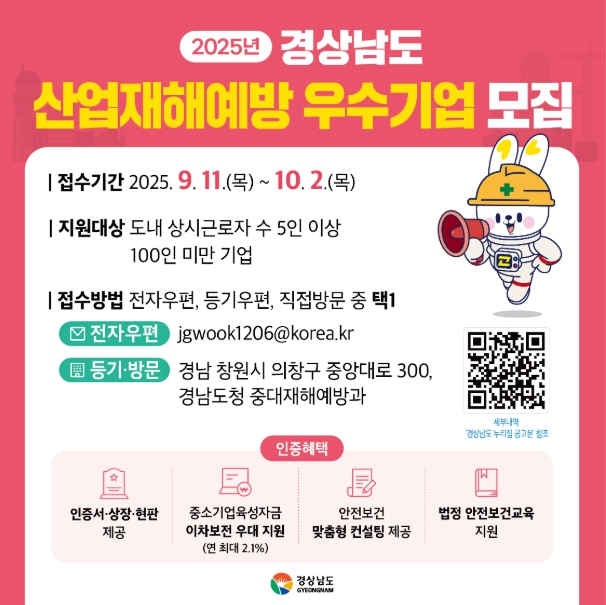 [무한뉴스=최진수 기자] 경상남도는 ‘2025년 경상남도 산업재해 예방 우수기업 인증 사업’ 접수를 시작했다고 밝혔다.