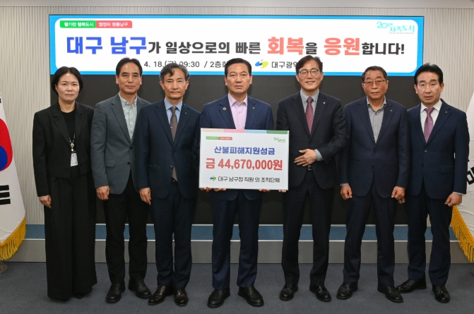 [무한뉴스=최진수 기자] 대구 남구는 최근 발생한 산불피해지역 주민들을 돕기 위해 4,467만원의 성금을 기부했다고 밝혔다.