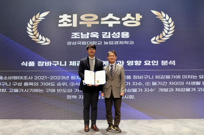 [무한뉴스=최진수 기자] 경상국립대학교(GNU·총장 권진회) 농업경제학과 박사과정 조남욱 씨가 12월 12일 서울 양재aT센터에서 열린 ‘2025 식품소비행태조사 활용 우수논문 경진대회’에서 ‘최우수논문상’(지도교수 김성용)을 수상했다.