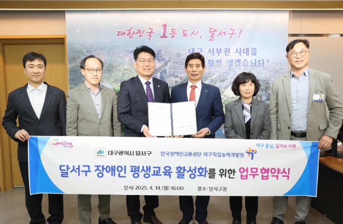 [무한뉴스=최진수 기자] 대구 달서구가 지난 14일 한국장애인고용공단 대구직업능력개발원과 장애인 평생교육 활성화를 위한 업무협약을 체결했다.
