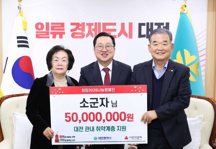 [무한뉴스=정민정 기자] 대전시는 15일 오전 시청 10층 응접실에서 아너소사이어티 회원인 소군자 기부자(124호)로부터 대전사회복지공동모금회를 통해 관내 취약계층 지원을 위한 성금 5천만 원을 전달받았다.