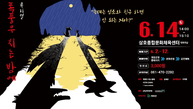 [무한뉴스=정민정 기자] 영암군이 토요일인 6월14일 삼호종합문화체육센터 대회의실에서 온 가족이 함께 즐길 수 있는 가족뮤지컬 ‘폭풍우 치는 밤에’를 상연한다.