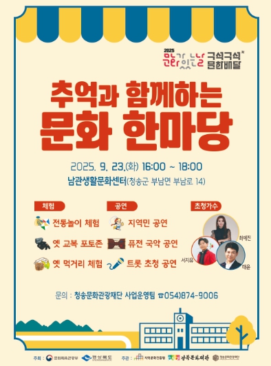 [무한뉴스=최진수 기자] (재)청송문화관광재단은 오는 9월 23일 오후 4시부터 6시까지 부남면에 위치한 남관생활문화센터에서 2025 문화가 있는 날 ‘구석구석 문화배달’ 프로그램의 일환인 ‘추억과 함께하는 문화한마당’을 개최한다.