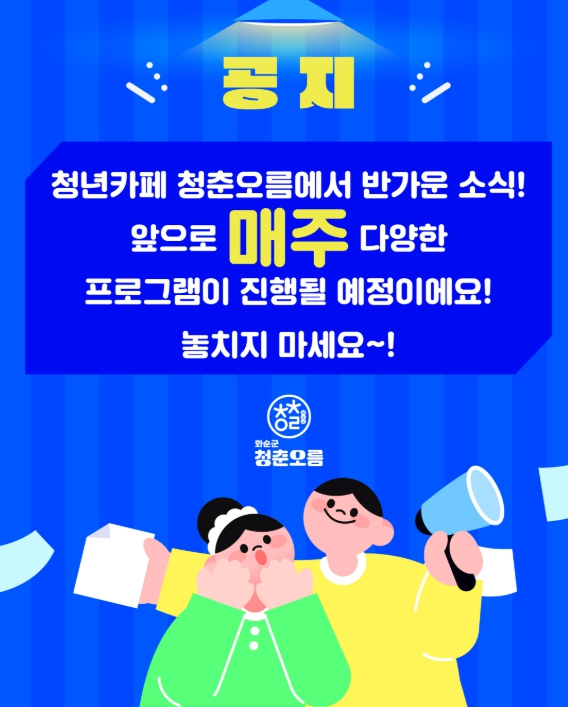 청년카페 ‘청춘오름’은 청년성장프로젝트 사업의 일환으로 현재는 청년의 일상 유지 및 1:1 초기상담과 청년들의 역량 강화를 위한 프로그램을 진행하고 있으나, 청년들이 놀고·먹고·쉬어가는 청년 친화적 공간으로 추가 조성하여 청년들의 자율적 활동을 지원하고, 지역 청년 네트워크 형성 및 정착을 유도하는 기능으로 탈바꿈한다.
