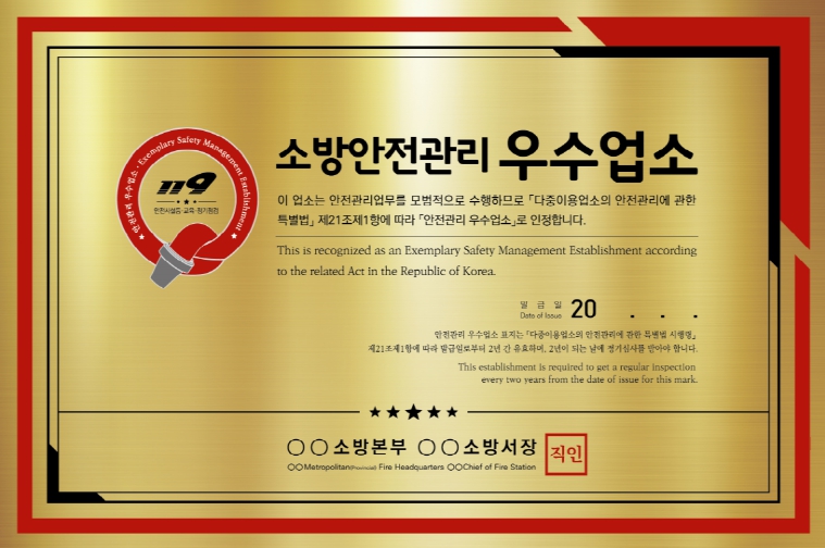 ‘소방안전관리 우수업소 인정’은 영업주의 자율적 안전관리 노력을 장려하고, 안전문화 확산과 자긍심 고취를 위해 ‘다중이용업소의 안전관리에 관한 특별법’에 따라 운영되고 있다.