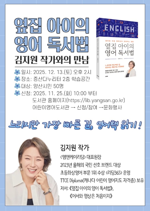 [무한뉴스=최진수 기자] 양산시립 어린이영어도서관은 오는 12월 13일 오후 2시 『옆집 아이의 영어 독서법』의 저자 김지원 작가를 초청하여 작가와의 만남을 운영한다.