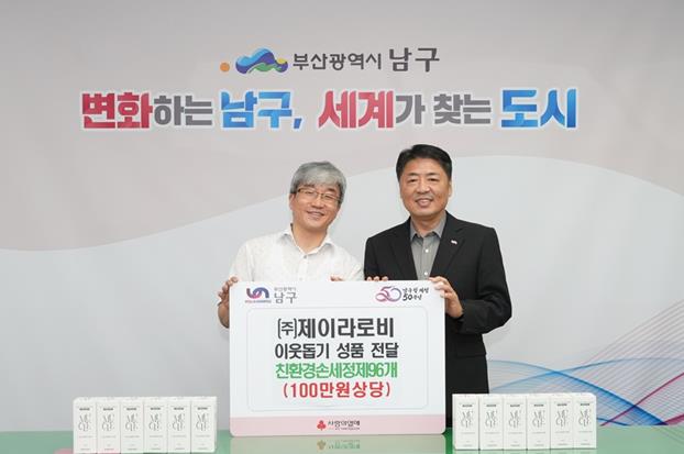 [무한뉴스=최진수 기자] ㈜제이라로비는 지난 15일 부산 남구에 100만 원 상당의 후원 물품(손세정제)을 전달했다.