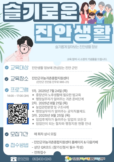 교육 신청은 회차별로 상시 접수 중이다. 진안군귀농귀촌종합지원센터 홈페이지 또는 포스터 상단의 QR코드를 통해 신청할 수 있으며, 전화로도 가능하다. 교육 참여자에게는 소정의 기념품도 제공된다.