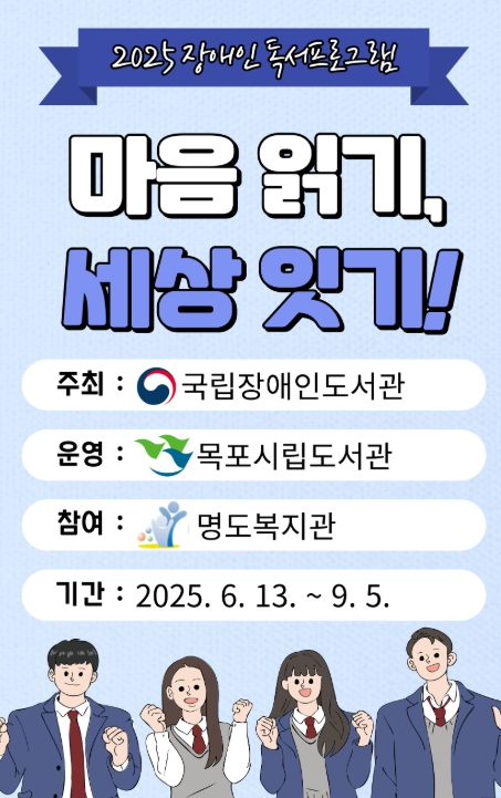 [무한뉴스=정민정 기자] 목포시립도서관이 국립장애인도서관이 주최한 ‘2025년 장애인 독서문화 프로그램’ 공모사업에 선정되어, 오는 6월부터 명도복지관과 협력해 발달장애 청소년을 위한 독서문화 프로그램을 운영한다.