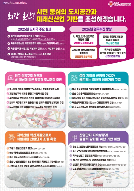 [무한뉴스=최진수 기자] 울산시가 ‘최강 울산!’ 완성을 위한 시민 중심의 도시공간 조성과 미래 신산업 기반 구축을 목표로 2026년 도시 분야 정책을 추진한다.