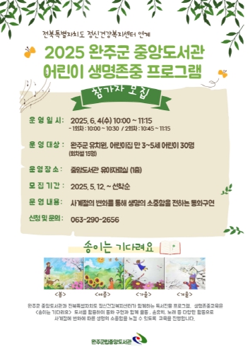 [무한뉴스=정민정 기자] 완주군 중앙도서관에서 오는 6월 4일 관내 만 3세~5세 유아를 대상으로 생명존중교육 프로그램을 운영한다.
