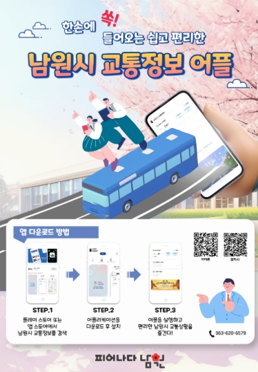 또한, 각종 시정 소식지에도 어플리케이션 설치용 QR코드를 삽입해 시민들이 손쉽게 설치할 수 있도록 지원할 방침이다. 남원시 관계자는 “이러한 지속적인 홍보를 통해 어플리케이션 사용이 점차 확대되고, 시민들의 대중교통 이용 편의도 크게 향상될 것으로 기대된다.”라고 전했다.