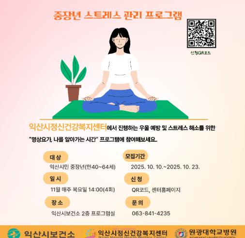 [무한뉴스=정민정 기자] 익산시정신건강복지센터는 만 40~64세 중장년을 대상으로 '마음힐링 명상요가' 프로그램을 운영한다고 10일 밝혔다.