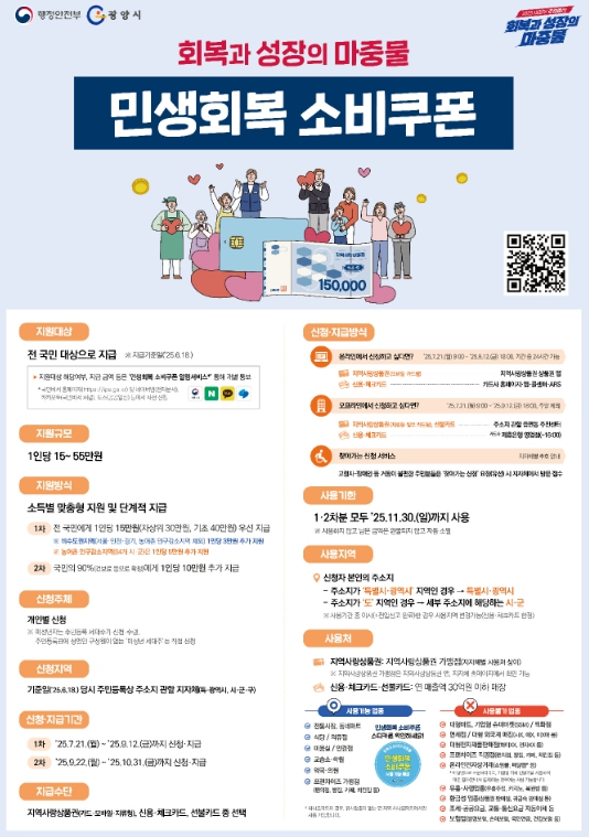 정인화 광양시장은 “민생회복 소비쿠폰은 단순한 소비 지원에 그치지 않고, 지역 내 소비를 촉진함으로써 소상공인과 자영업자의 매출 회복에도 실질적인 도움이 될 것”이라며 “지급대상자에게 신속하게 지급해 조속한 소비로 이어지도록 하겠다”고 밝혔다.