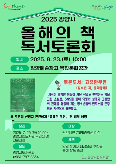 [무한뉴스=정민정 기자] 광양시립도서관은 독서와 토론 문화 활성화 및 건전한 독서문화 정착을 위해 오는 8월 23일 오전 10시, 광양예술창고 복합문화공간에서 ‘2025 올해의 책’ 독서토론회를 개최한다고 밝혔다.