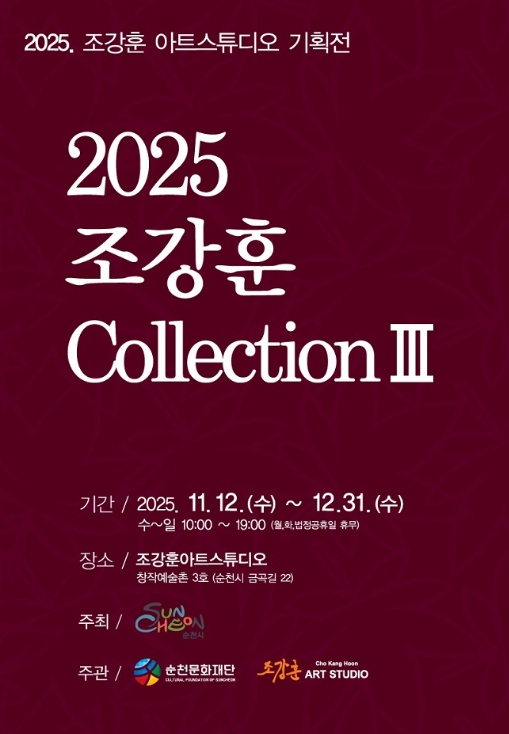[무한뉴스=정민정 기자] 순천문화재단은 오는 11월 12일부터 12월 31일까지 창작예술촌 3호 조강훈 아트 스튜디오에서 ‘2025 조강훈 컬렉션Ⅲ’ 전시를 개최한다.