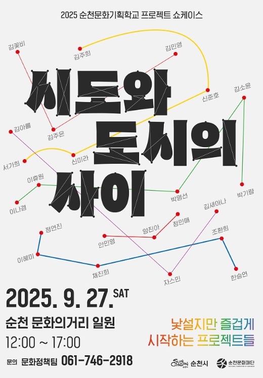 [무한뉴스=정민정 기자] (재)순천문화재단은 오는 27일 오후 12시부터 5시까지 문화의 거리 일원에서 2025 순천문화기획학교 프로젝트 쇼케이스 '시도와 도시의 사이'를 개최한다.