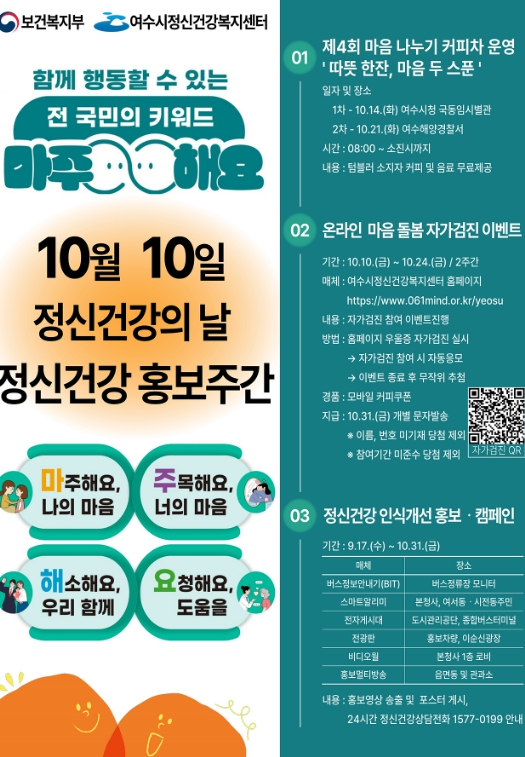 [무한뉴스=정민정 기자] 여수시는 정신건강의 날(10월 10일)을 기념해 10월 10일부터 24일까지 ‘2025년 정신건강 홍보주간’을 운영한다.