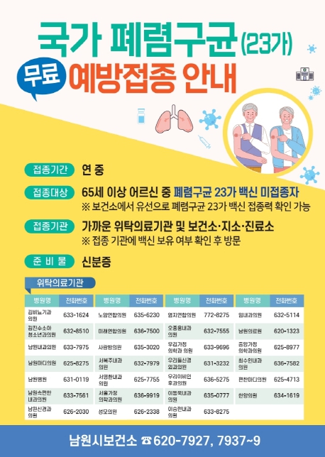 [무한뉴스=정민정 기자] 남원시가 64세 이상 어르신을 대상으로 폐렴구균 무료 예방접종을 연중 실시한다.