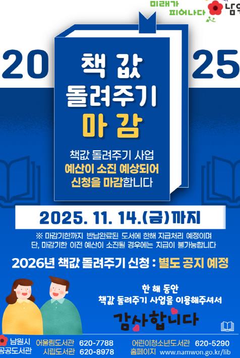 [무한뉴스=정민정 기자] 남원시는 시민들의 일상 속 독서문화 향유 기회를 확대하기 위해 추진해 온 ‘책값 돌려주기 사업’이 시민들의 높은 참여로 예산이 조기 소진됨에 따라, 올해는 11월 14일자로 마감된다고 밝혔다.