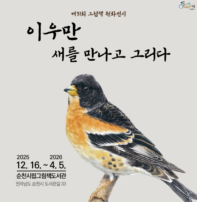 [무한뉴스=정민정 기자] 순천시는 오는 16일부터 2026년 4월 5일까지 순천시립그림책도서관에서 제31회 그림책 원화전시 '이우만 새를 만나고 그리다' 를 개최한다.