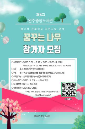 자세한 사항 및 참여 신청은 완주군 중앙도서관 홈페이지독서문화행사 안내를 참고해 링크 또는 QR 접수 가능하다.