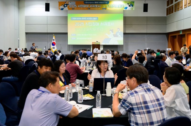 [무한뉴스=정민정 기자] 서귀포시는 서귀포시지역사회보장협의체와 함께 17일 제주국제컨벤션센터 영주홀에서 토론 참여자를 비롯해 오순문 서귀포시장, 제주특별자치도의회 의원 등 120여 명이 참석한 가운데 ‘2025 시민참여 서귀포시 100인 원탁토론회’를 개최했다.