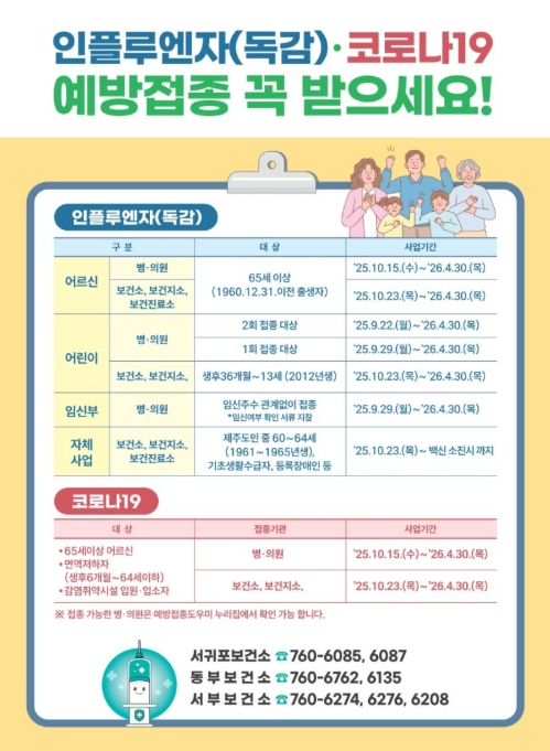 [무한뉴스=정민정 기자] 서귀포시 서부보건소에서는 인플루엔자(독감)와 코로나19 등 동절기 감염병의 예방을 위해 고위험군을 중심으로 예방접종에 적극 참여를 당부했다.