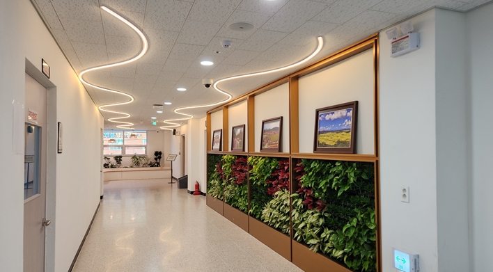[무한뉴스=정민정 기자] 철원군은 7월에 조성한 와수복합어울림센터 4층 작은영화관 실내정원의 큰 호응에 힘입어, 2층 프로그램실 간 복도에 유휴공간을 활용하여 추가로 수직 정원 조성을 완료했다고 28일 밝혔다.