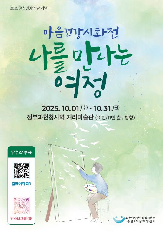 안영미 과천시정신건강복지센터 부설 자살예방센터장은 “이번 시화전이 시민들이 나 자신과 서로를 이해하는 계기가 되길 바란다”라며, “앞으로도 정신건강 인식 개선과 회복 지원을 위해 다양한 노력을 이어가겠다”라고 말했다.